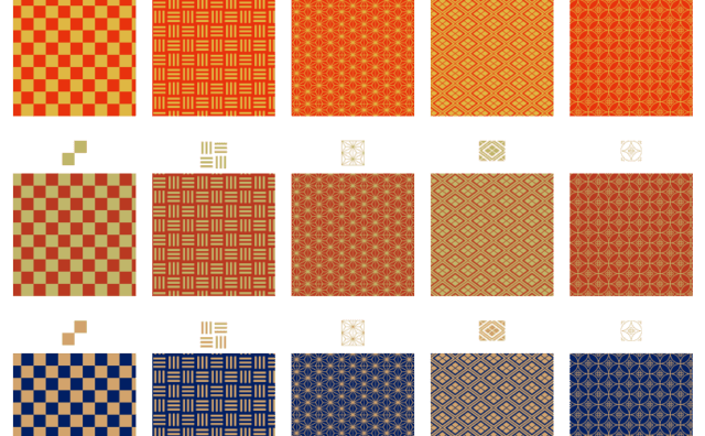 グラフィックスタイル・アピアランス金色の和風柄パターンイラストセット Vol.1 金色の和風柄パターンを詰め合わせたイラストセットです!Vol.1は市松模様、五崩し模様、麻の葉模様、四つ割菱、七宝花菱の5パターンを収録しています。このイラストは、和風デザインの背景や模様としてお役立ていただけます。シームレスなパターンですので編集や加工も手軽です。もちろん、無料かつ商用利用可能なフリー素材ですので、自由にご利用いただけます。グラフィックスタイル・アピアランス